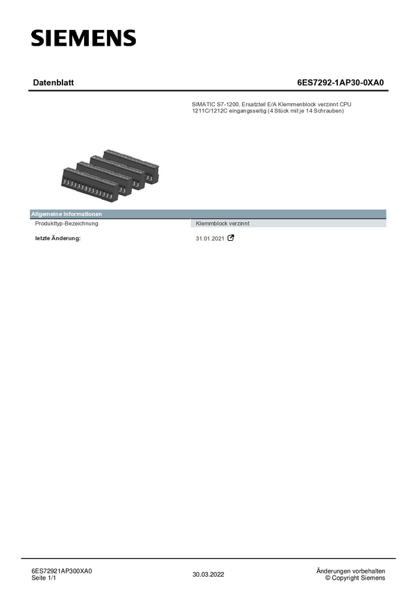 Blok zaciskowy PLC Siemens 6ES7292-1AP30-0XA0 6ES72921AP300XA0