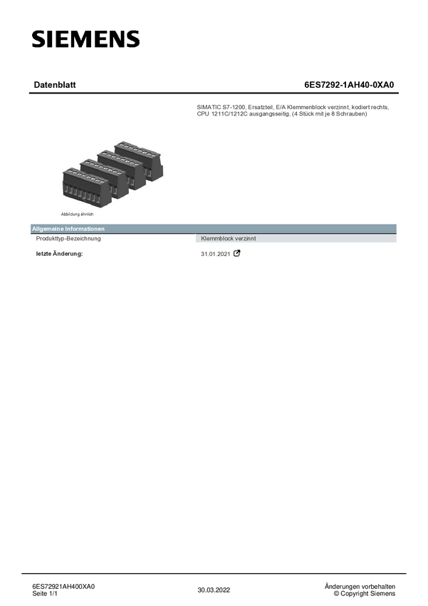 Blok zaciskowy PLC Siemens 6ES7292-1AH40-0XA0 6ES72921AH400XA0