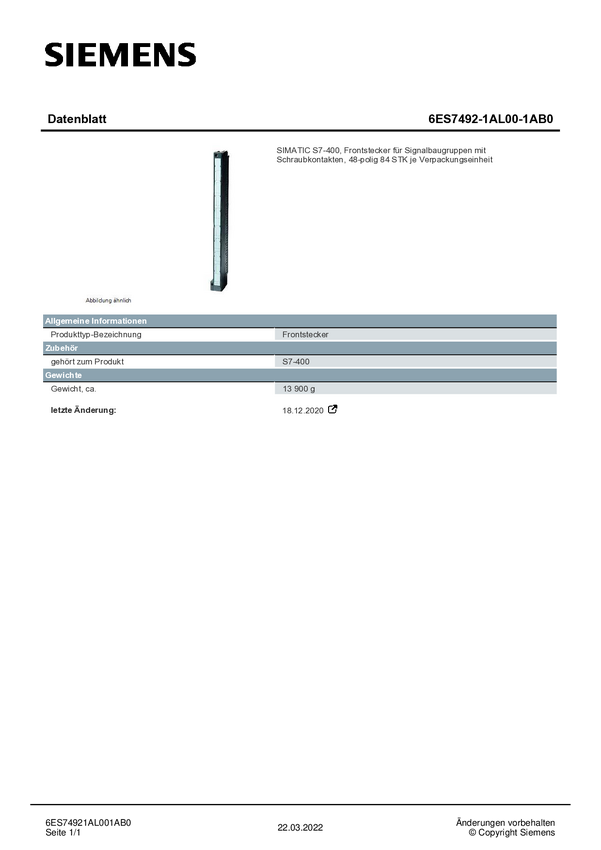 6ES74921AL001AB0 Wtyczka PLC Siemens 6ES7492-1AL00-1AB0 6ES74921AL001AB0, 1 szt.