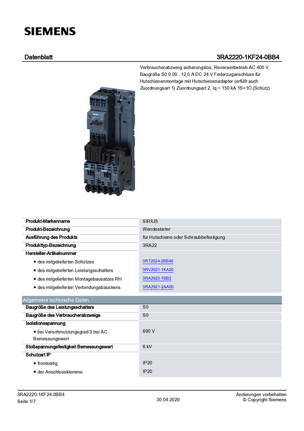 3RA22201KF240BB4 Siemens 3RA2220-1KF24-0BB4 3RA22201KF240BB4 Rozrusznik nawrotny Moc silnika...