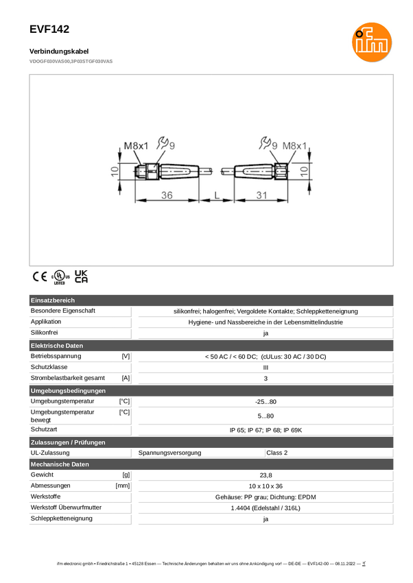 ifm Electronic EVF142 Linia połączenia EVF142, piny: 3, 3, 0.3 m, 1 szt.