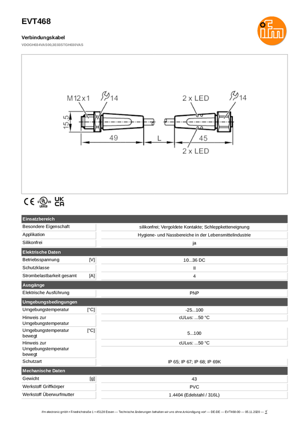 ifm Electronic EVT468 Linia połączenia EVT468, piny: 3, 5, 0.3 m, 1 szt.