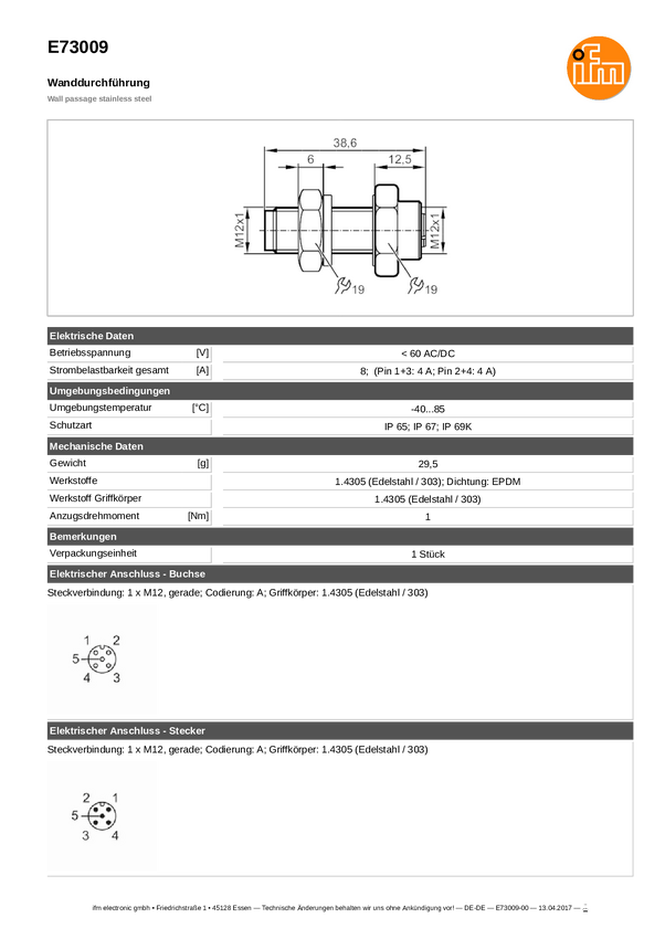 E73009 ifm Electronic E73009 Przepust ścienny E73009, piny: 5, 5, 1 szt.