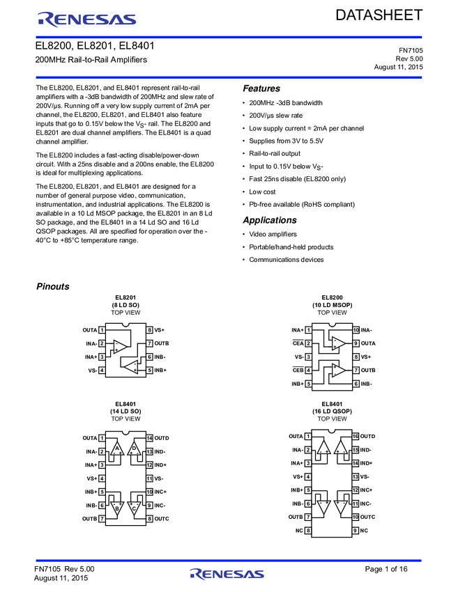 EL8200IY 200MHz Rail-to-Rail Amplifiers