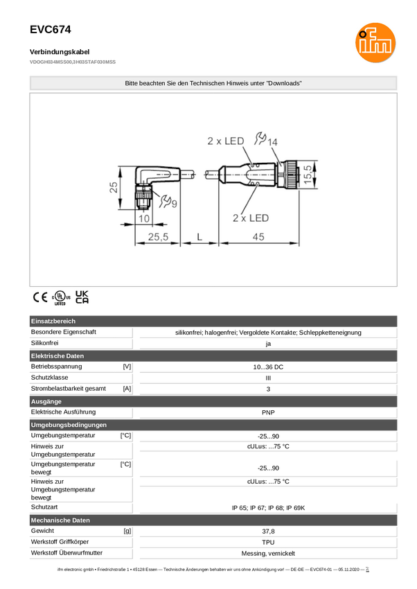 ifm Electronic EVC674 Linia połączenia EVC674, piny: 3, 5, 0.3 m, 1 szt.