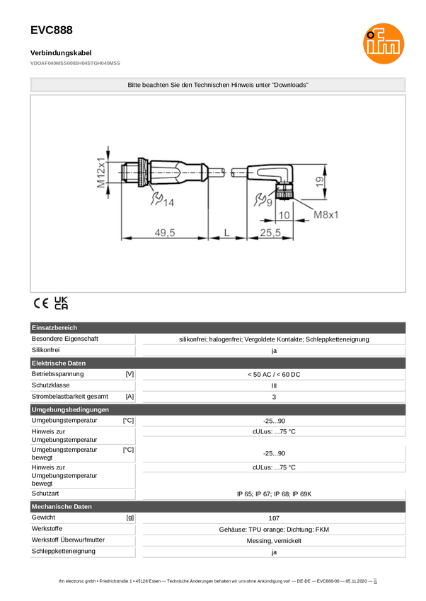 ifm Electronic EVC888 Linia połączenia EVC888, piny: 4, 4, 3 m, 1 szt.