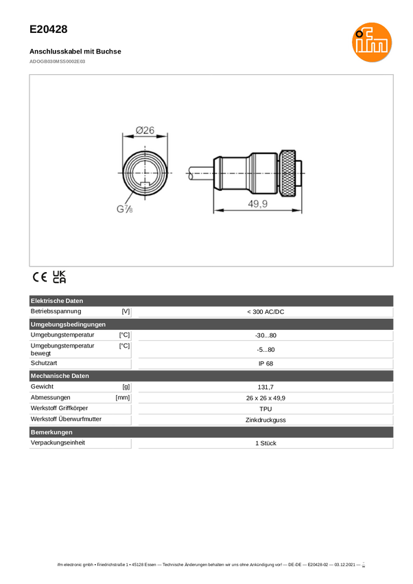 ifm Electronic E20428 Kabel połączeniowy E20428, 2 m, 1 szt.