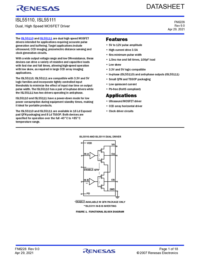 ISL55110IRZ-T, ISL55110IRZ-T7A, ISL55110IVZ, ISL55110IVZ-T, ISL55110IVZ-T7A, ISL55110