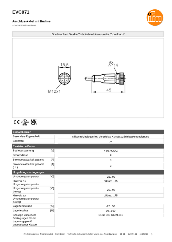 EVC071 ifm Electronic EVC071 Kabel połączeniowy EVC071, piny: 5, 5 m, 1 szt.