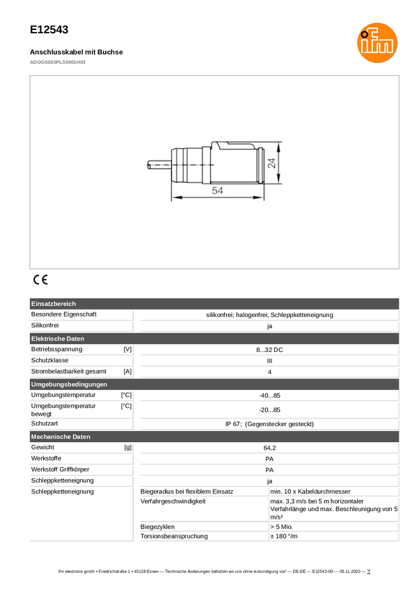 E12543 ifm Electronic E12543 Kabel połączeniowy E12543, piny: 6, 1 m, 1 szt.