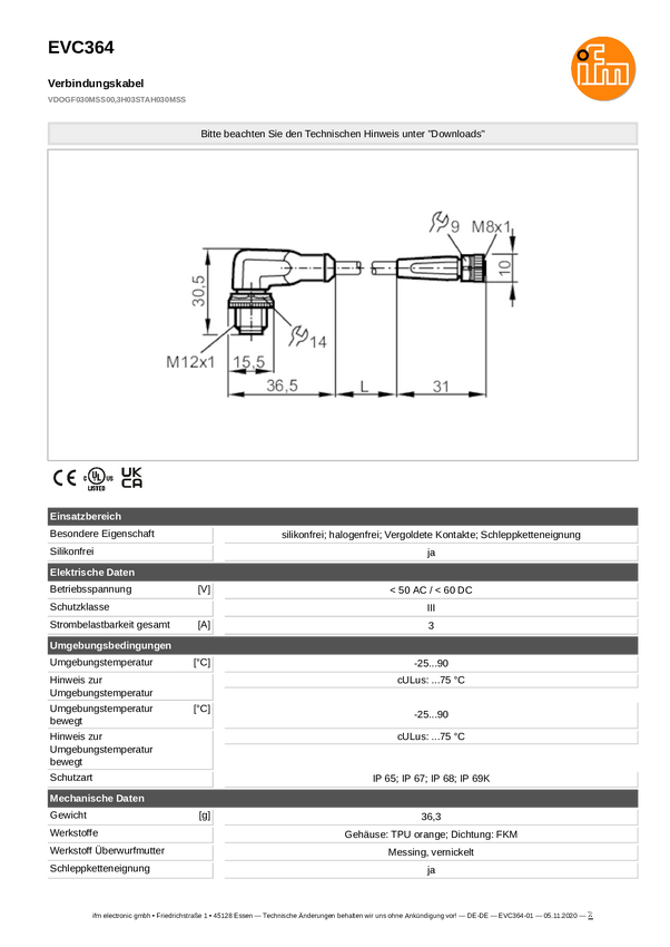 EVC364 ifm Electronic EVC364 Linia połączenia EVC364, piny: 3, 3, 0.3 m, 1 szt.