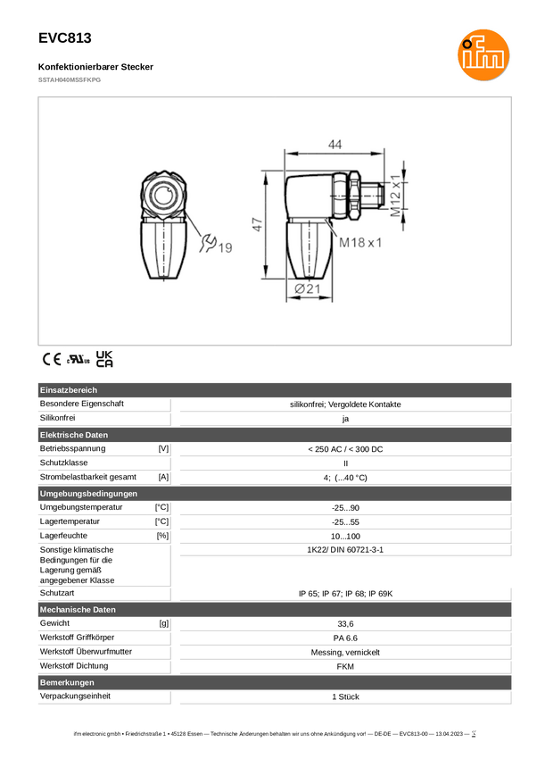 ifm Electronic EVC813 Złącze niekonfekcjonowane czujnika/aktuatora EVC813, piny: 4, 1 szt.