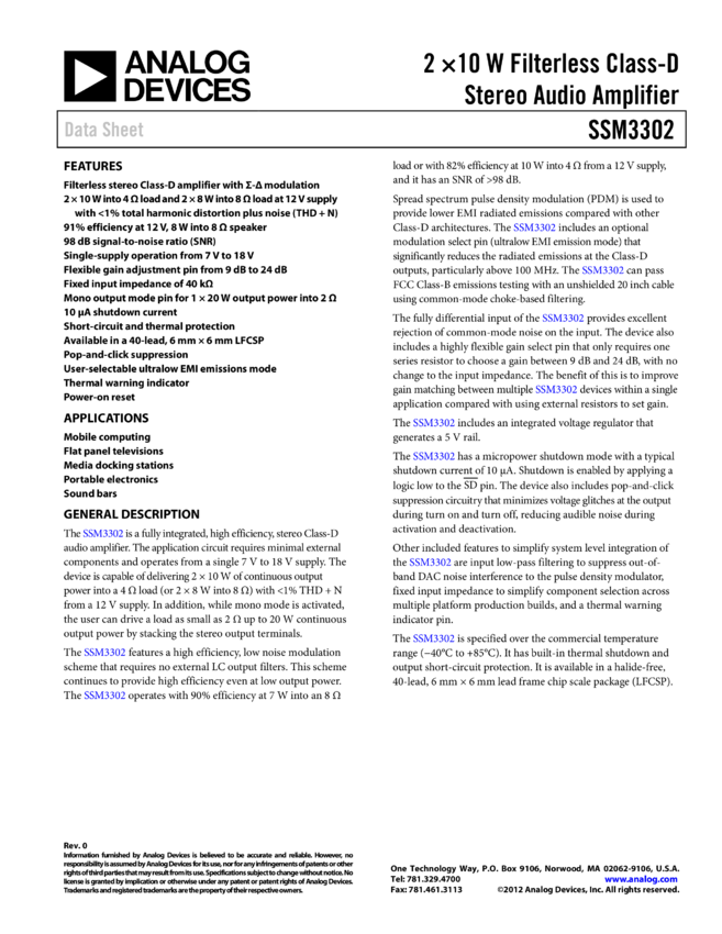 SSM3302: 2 ×10 W Filterless Class-D Stereo Audio Amplifier