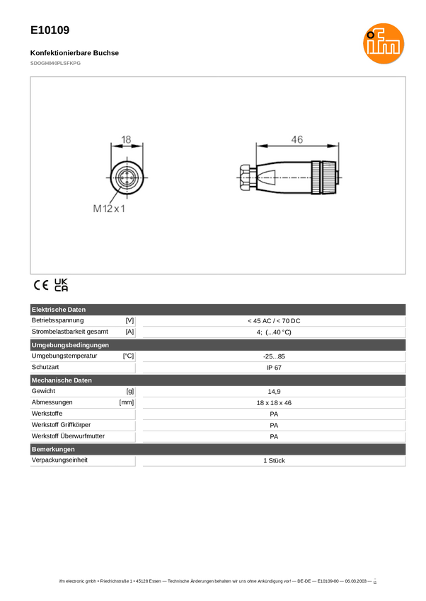 E10109 ifm Electronic E10109 Złącze niekonfekcjonowane czujnika/aktuatora E101...