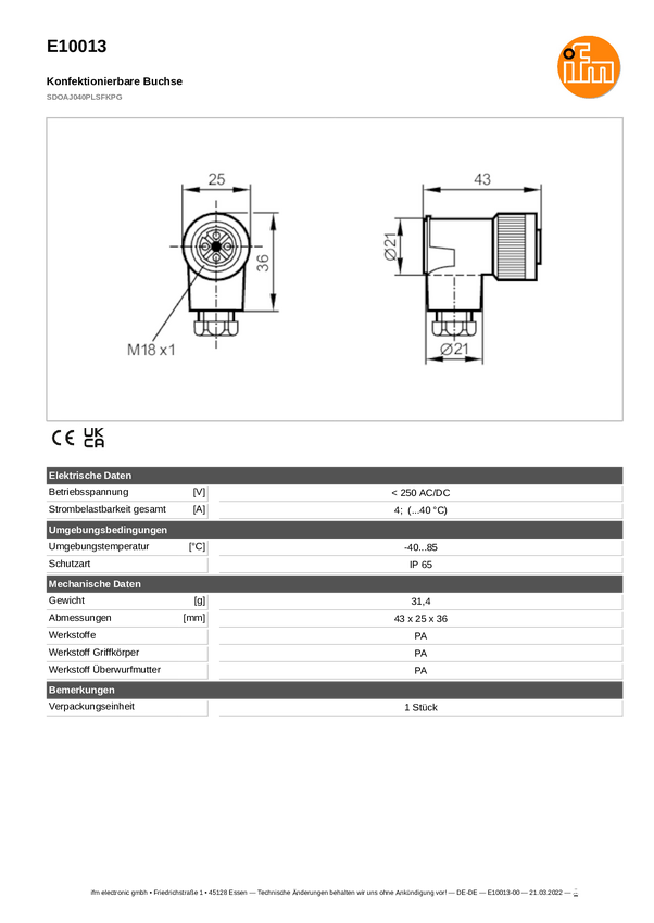 E10013 ifm Electronic E10013 Złącze niekonfekcjonowane czujnika/aktuatora E100...