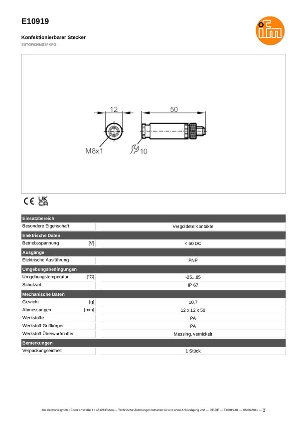E10919 ifm Electronic E10919 Złącze niekonfekcjonowane czujnika/aktuatora E109...