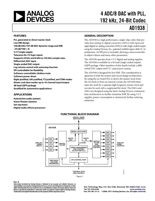 AD1938 4 ADC/8 DAC with PLL, 192 kHz, 24-Bit CODEC