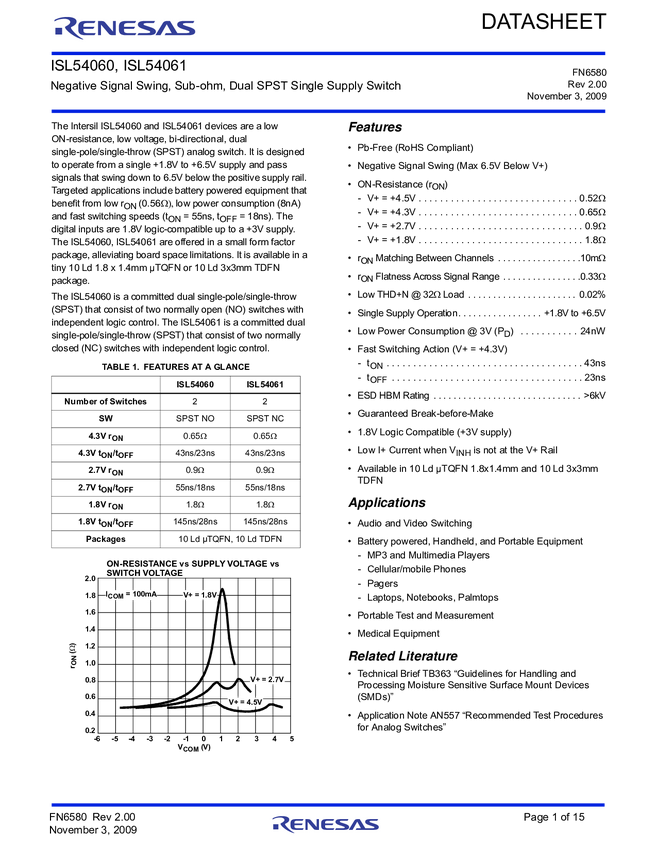 ISL54060IRTZ Negative Signal Swing, Sub-Ohm, Dual SPST Single Supply Switch