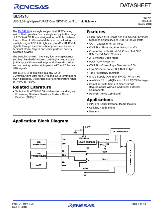 ISL54216IRTZ USB 2.0 High-Speed/UART Dual SP3T (Dual 3 to 1 Multiplexer)
