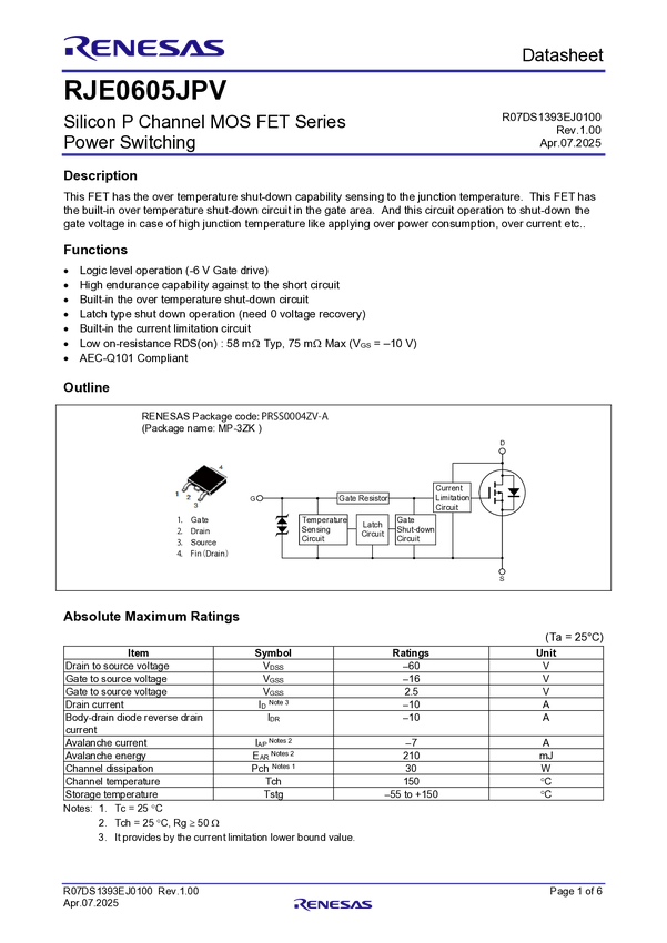 RJE0605JPV-00#Q7 P-Channel Thermal FET -60V -10A 75mohm TO-252/DPAK