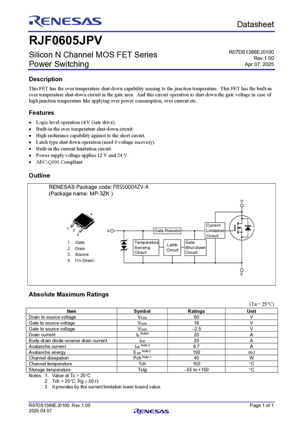 RJF0605JPV-00#Q7 N-Channel Thermal FET 60V 20A 38mohm TO-252/DPAK