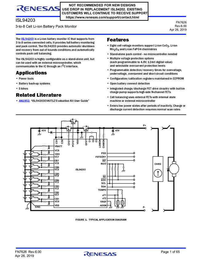 ISL94203IRTZ 3-to-8 Cell Li-ion Battery Pack Monitor