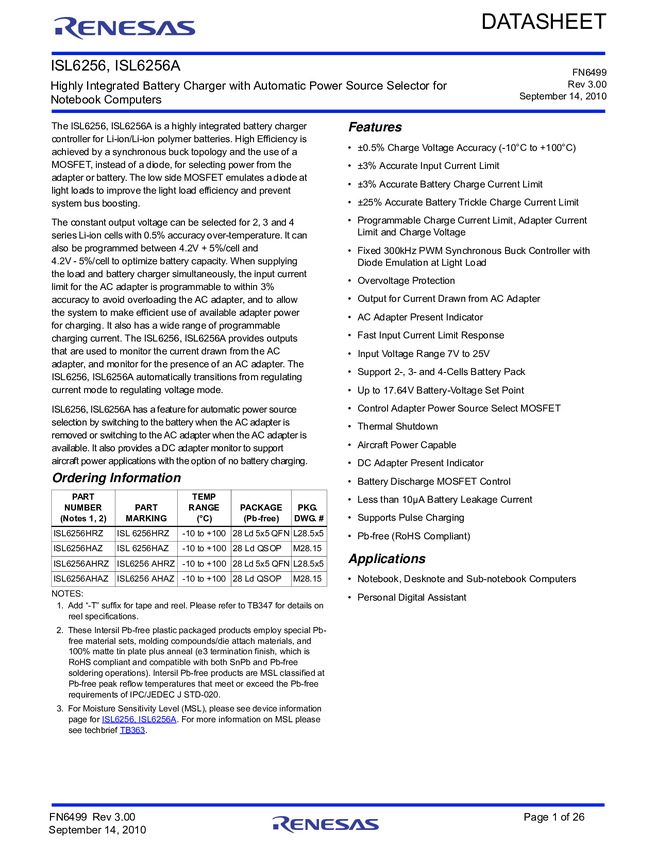 ISL6256AHAZ Highly Integrated Battery Charger with Automatic Power Source Selector for...