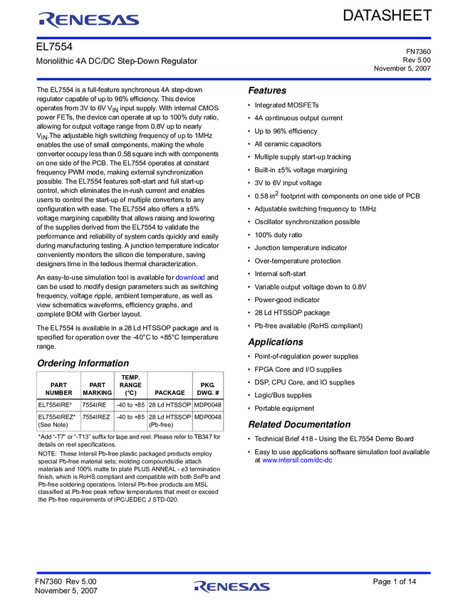 EL7554IREZ Monolithic 4A DC/DC Step-Down Regulator