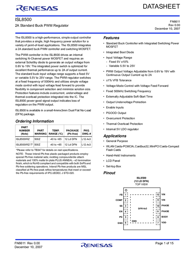 ISL8500IRZ 2A Standard Buck PWM Regulator