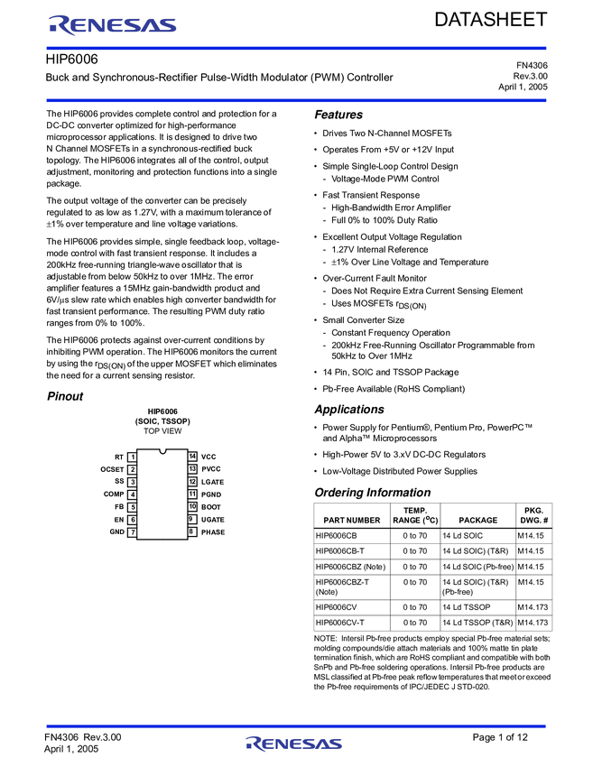 HIP6006CBZ Buck and Synchronous-Rectifier Pulse-Width Modulator (PWM) Controller