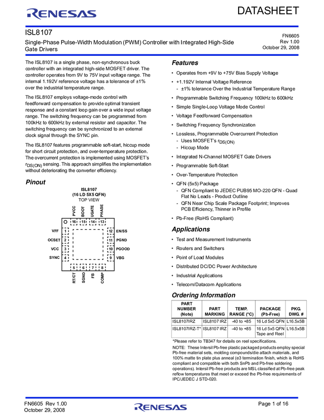ISL8107IRZ Single-Phase Pulse-Width Modulation (PWM) Controller with Wide (9V-75V) VIN...