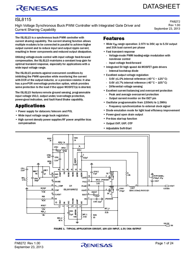 ISL8115FRTZ High Voltage Synchronous Buck PWM Controller with Integrated Gate Driver an...