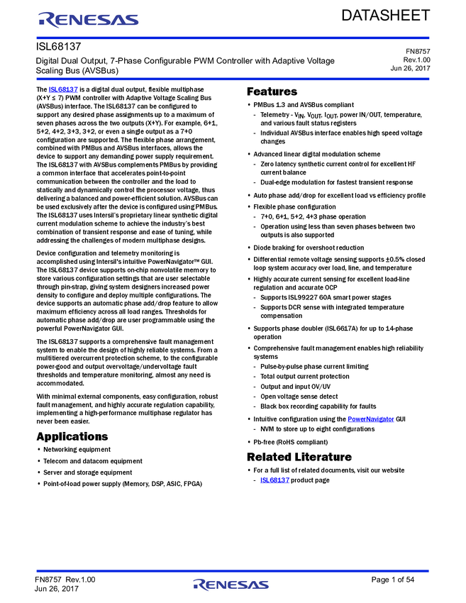 ISL68137IRAZ Digital Dual Output, 7-Phase Configurable PWM Controller with Adaptive Volt...