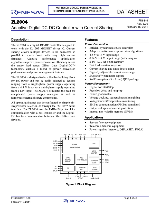 ZL2004ALNF Adaptive Digital DC-DC Controller with Current Sharing