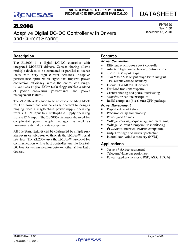 ZL2006ALNF Adaptive Digital DC-DC Controller with Drivers and Current Sharing