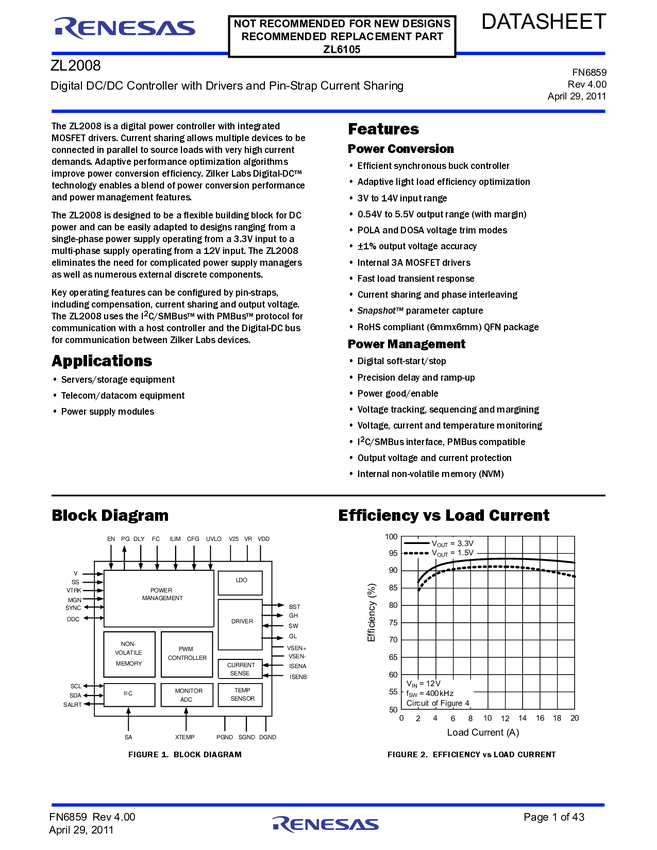 ZL2008ALBFT Digital DC-DC Controller with Drivers and Pin-Strap Current Sharing