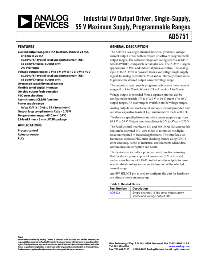 AD5751: Industrial I/V Output Driver, Single Supply, 60v Compliance, Programmable Ranges