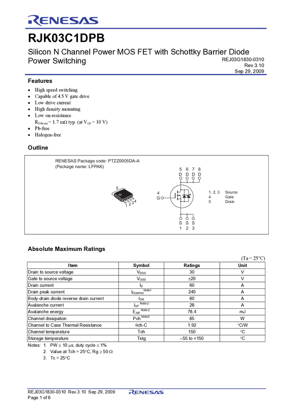 RJK03C1DPB-00#J5 Nch Single Power Mosfet 30V 60A 2.2Mohm Lfpak