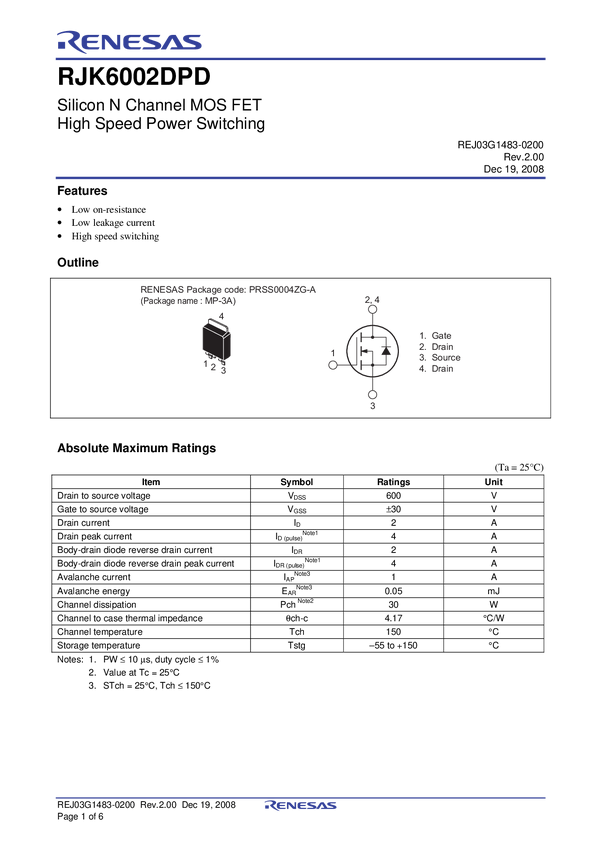 RJK6002DPD-00#J2 Nch Single Power Mosfet 600V 2A 6800Mohm Mp-3A/To-252