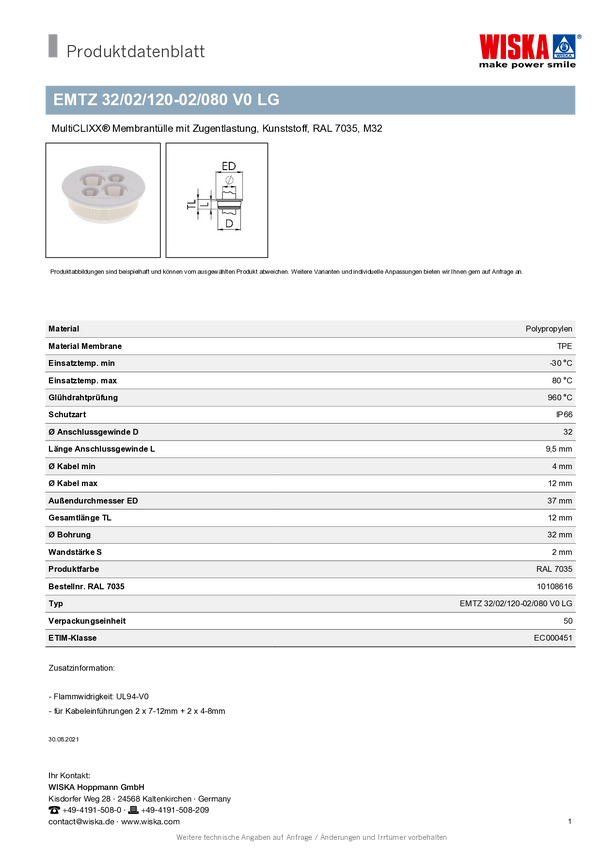 10108616 Wiska 10108616 Przepust kablowy EMTZ 32/02/120-02/080 V0 LG, (Ø...