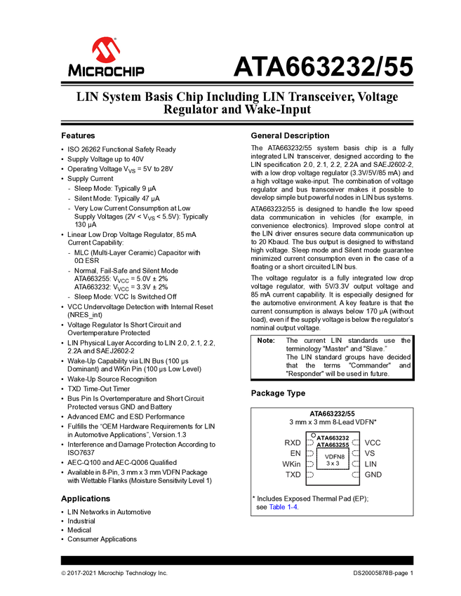 ATA663232/ATA663255 LIN System Basis Chip Including LIN Transceiver,