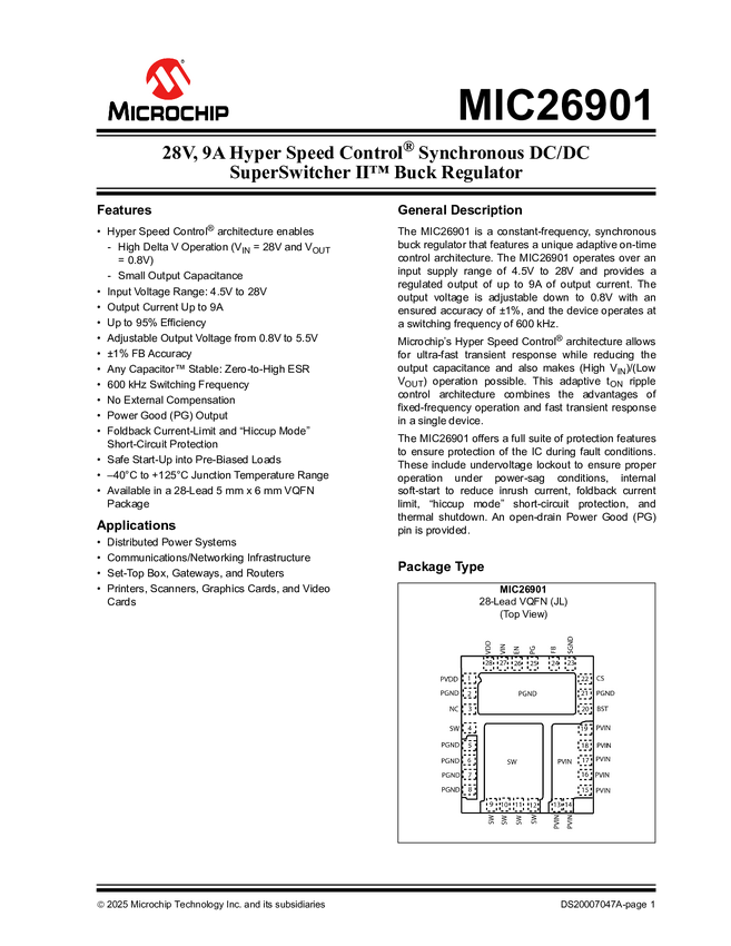 MIC26901 28V, 9A Hyper Speed Control® Synchronous DC/DC SuperSwitcher II™ Buck Regul...
