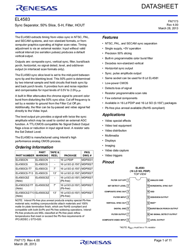EL4583 Sync Separator, 50% Slice, S-H, Filter, HOUT