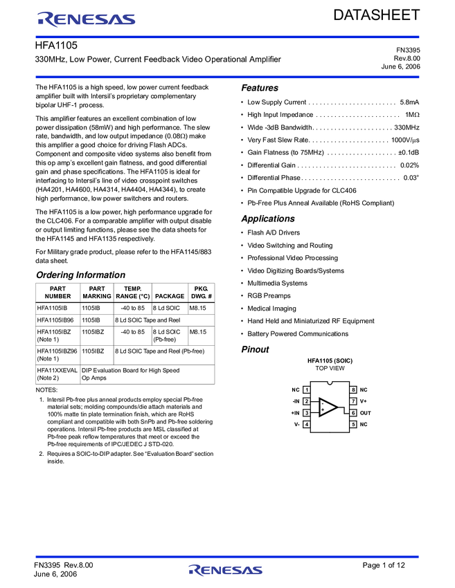 HFA1105 330MHz, Low Power, Current Feedback Video Operational Amplifier