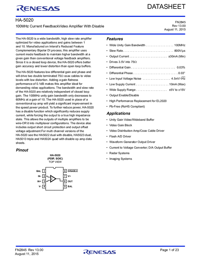 HA-5020 100MHz Current Feedback Video Amplifier With Disable