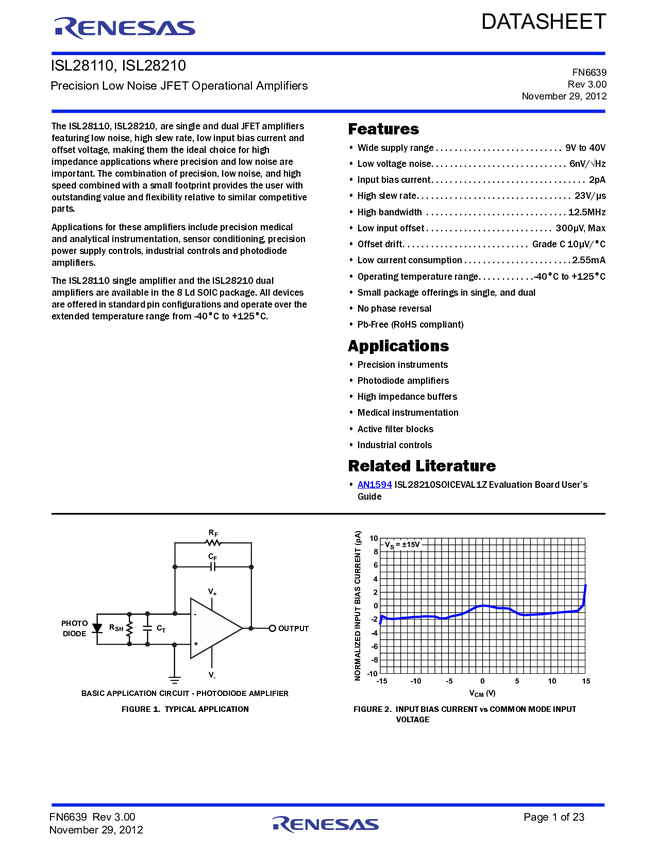 ISL28110 Precision Low Noise JFET Operational Amplifiers
