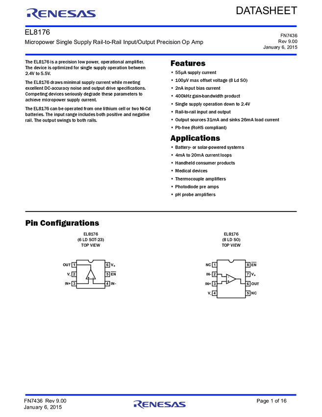 EL8176 Micropower Single Supply Rail-to-Rail Input-Output Precision Op Amp