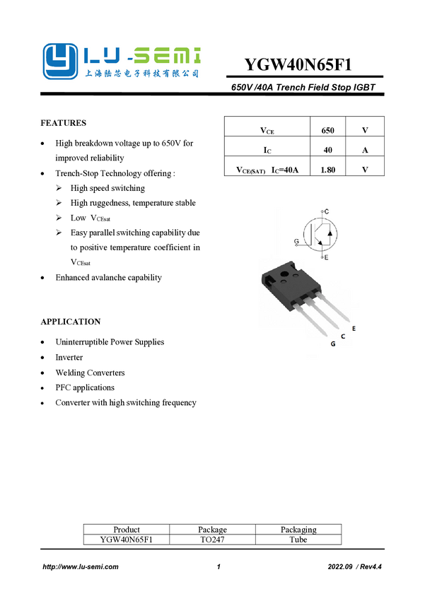 YGW40N65F1 Tranzystor; IGBT; 40A; 650V; 250W; TO247; THT; YGW40N65F1; LUXIN-SEMI; RoHS