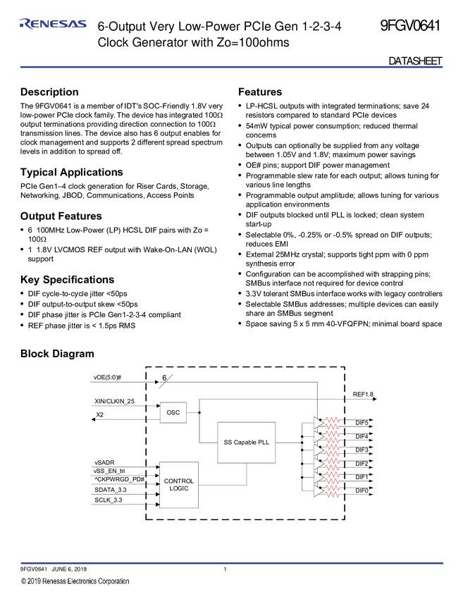 9FGV0641 6-output 1.8 V PCIe Gen1-4 Clock Generator with Zo=100 ohms