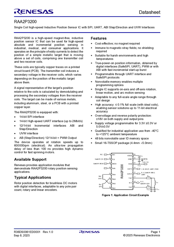 RAA2P3200E4GSP#HA0 High-Speed Inductive Position Sensor with Single Coil Sensing Element Featu...